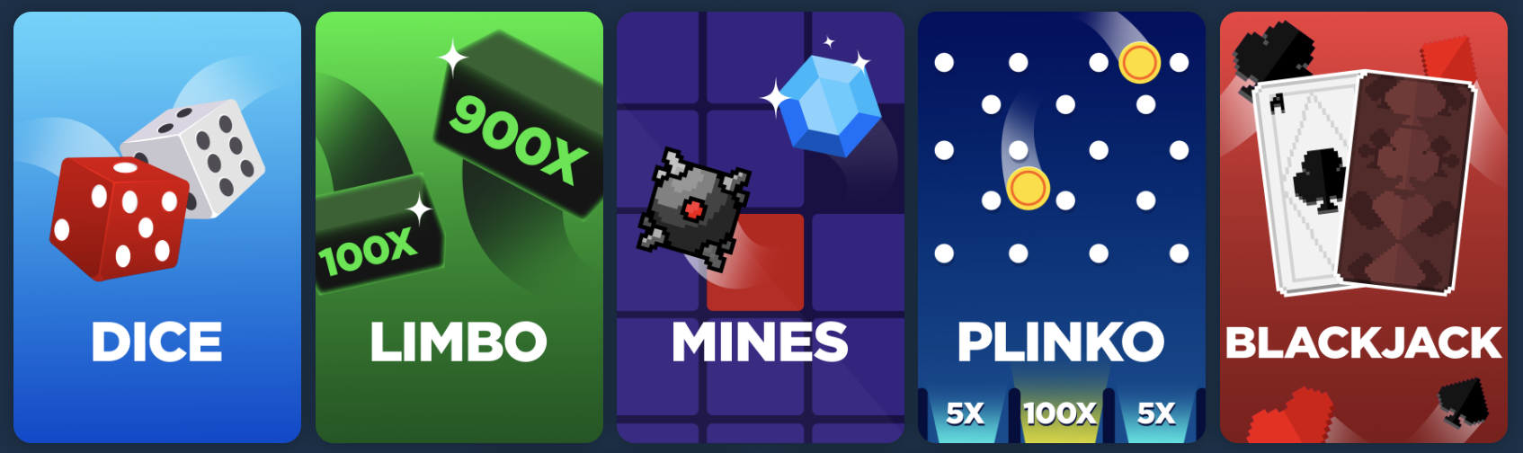 Dice, Limbo, Mines, Plinko, Roulette and Blackjack. These all are house games, i.e. you play against us! Look for these cards on the website, and simply click on the one you wish to play.